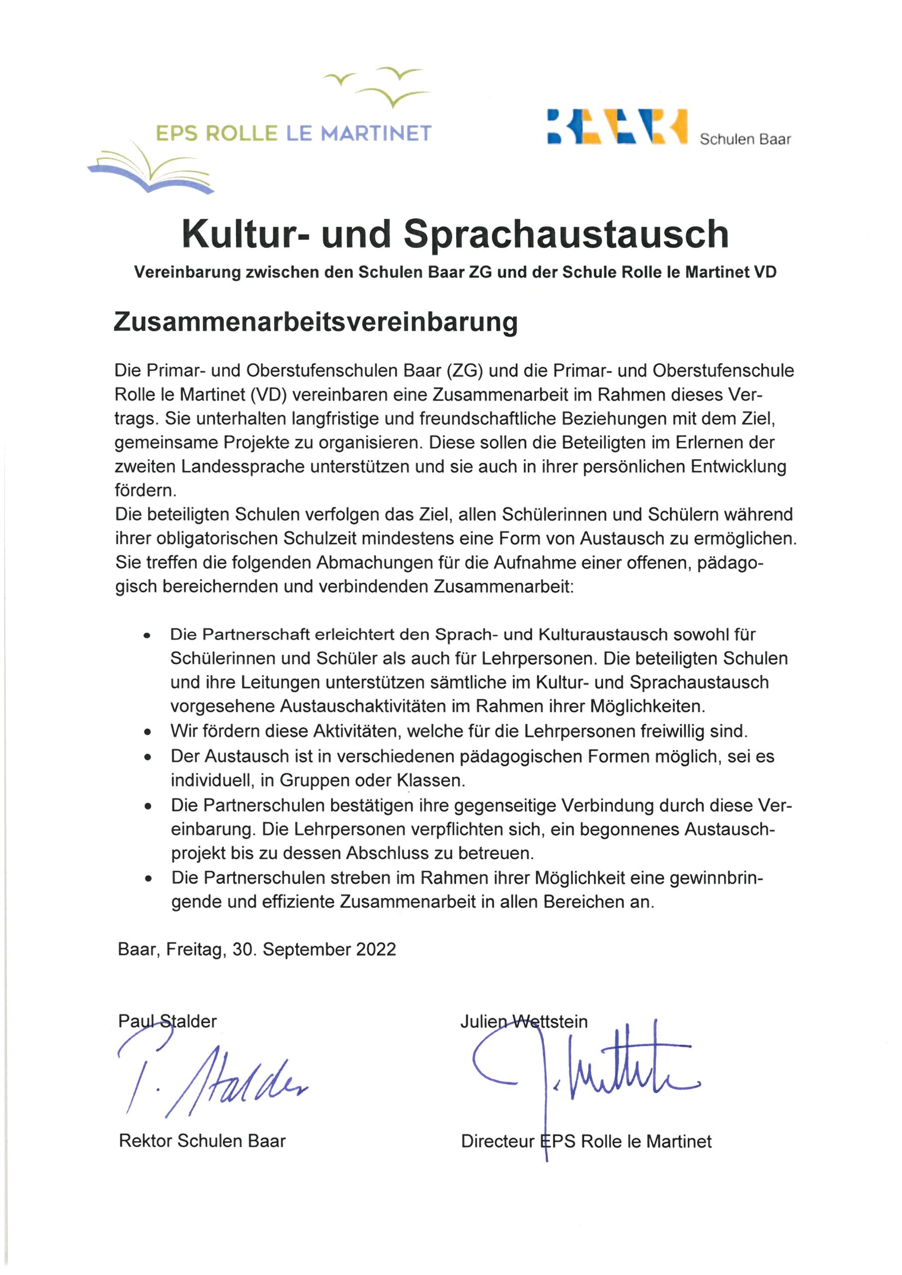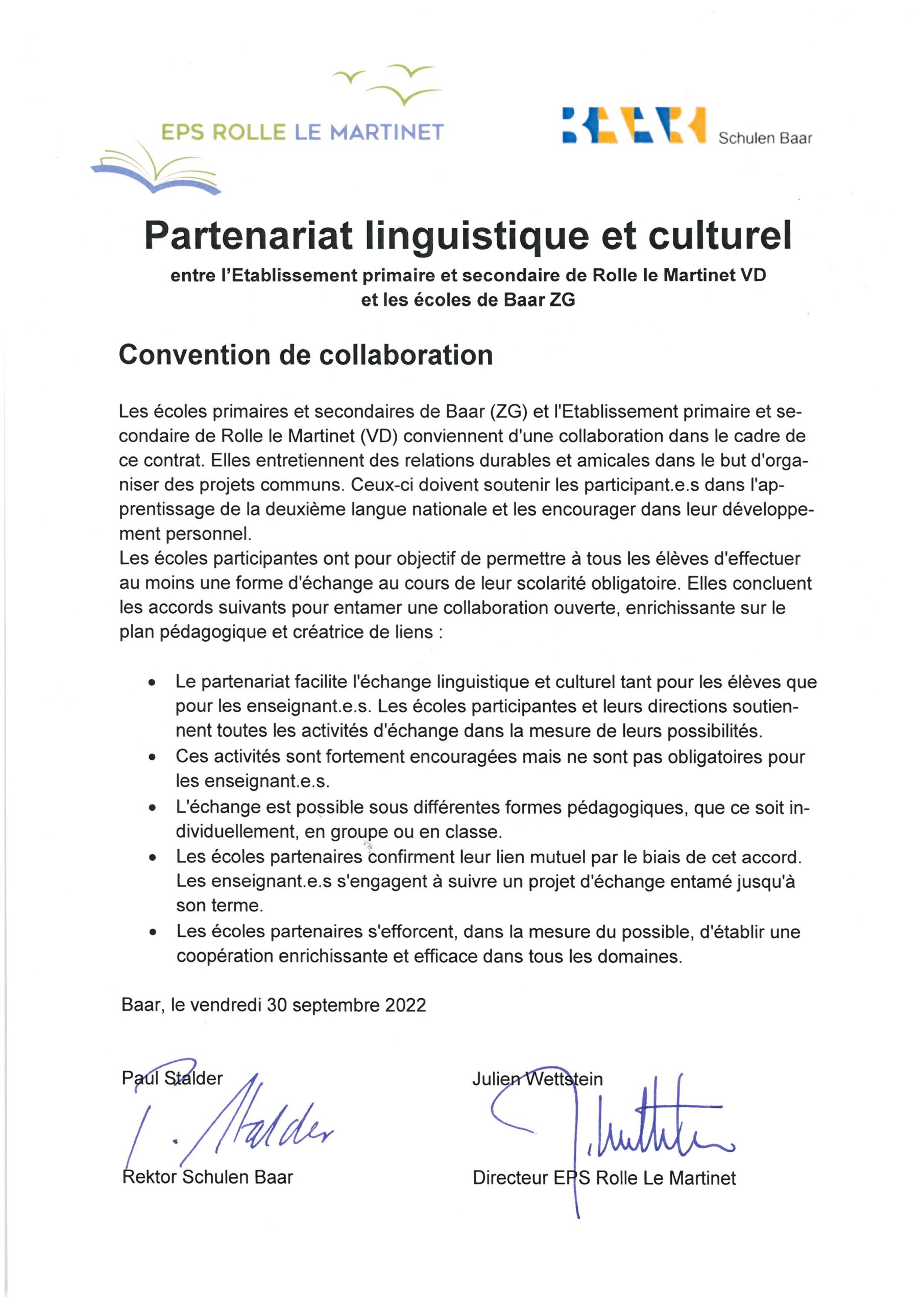 Partenariat linguistique et culturel entre l'EPS Rolle le Martinet et les écoles de Baar
